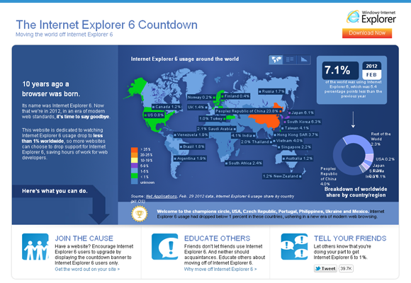 Es cuestión de tiempo que Internet Explorer 6 desaparezca de nuestras vidas, llegando a ser un lejano y molesto recuerdo, como en una mañana de resaca. El sitio Internet Explorer 6 Countdown nos muestra la progresiva caída en picado del que en su día (periodo 2002-2003) fue el rey de los navegadores.